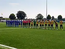 Seleções do Arquipélago de Chagos (azul) e Tuvalu (amarelo) antes do jogo pela Copa do Mundo CONIFA em junho de 2018.