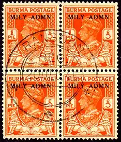 Selo de 1937, com a sobrecarga Burma sobre um selo da Índia.