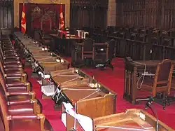 O trono e a cadeira no fundo da imagem são usadas pelo governador-geral e sua esposa ou seu marido durante a abertura do parlamento. O Presidente do Senado utiliza a cadeira em primeiro plano.