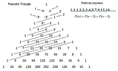 Erv Wilson em seu artigo The Scales of Mt. Meru[6] observou determinadas diagonais no triângulo de Pascal (ver diagrama) e marcou-os em papel em 1993. Os números de Padovan foram descobertos em 1994. Paul Barry (2004) mostrou que estas diagonais geram a sequência de Padovan somando os números diagonais.