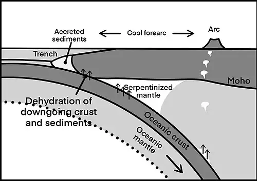 - ↑ a b Hyndman, Roy D; Peacock, Simon M (julho de 2003). «Serpentinization of the forearc mantle». Earth and Planetary Science Letters. 212 (3–4): 417–432. Bibcode:2003E&PSL.212..417H. doi:10.1016/S0012-821X(03)00263-2
