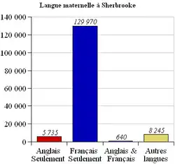 Apesar do passado e colonização inglesa, Sherbrooke é hoje uma cidade de maioria francófona. O bairro de Lonnoxville é o mais anglófono da região. Segundo o Statique Canada[6], os anglófonos são cerca de 4% da população e os francófonos, são 90%.