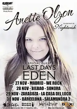 - ↑ a b c «Anette Olzon tour dates». Anette Olzon Official Website. Consultado em 15 de junho de 2024. Arquivado do original em 9 de maio de 2014