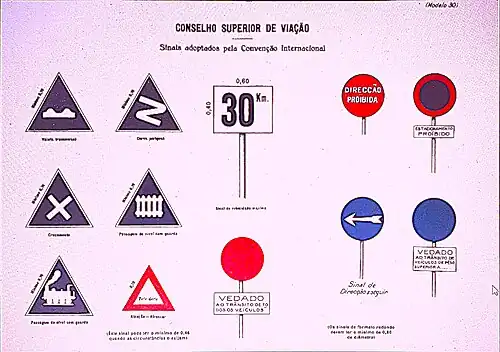 - ↑ PORTUGAL. Ministério das Comunicações, "Portaria n.º 23 429 -Aprova, para aplicação às disposições do capítulo I do Regulamento do Código da Estrada, vários sinais rodoviários", Diário do Governo n.º 138, série I, Lisboa: Imprensa Nacional, 1968