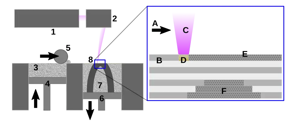 1 Laser 2 Sistema de escaneamento 3 Sistema de fornecimento de pó 4 Pistão de fornecimento de pó 5 Rolo 6 Pistão de fabricação 7 Leito de pó de fabricação 8 Objeto em fabricação (veja o detalhe) A Direção de escaneamento a laser B Partículas de pó sinterizadas (estado marrom) C Feixe de laser D Sinterização a laser E Leito de pó pré-colocado (estado verde) F Material não sinterizado em camadas anteriores