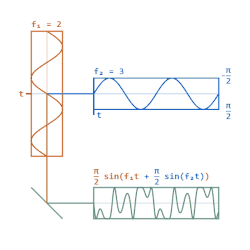 • Na síntese por modulação de frequência (FM), também conhecida como modulação de fase, uma onda portadora é modulada com a frequência de uma onda moduladora; a forma de onda complexa resultante pode, por sua vez, ser modulada por outra moduladora, e esta por outra, e assim por diante.[46] A síntese FM é caracterizada como “áspera”, “vítrea” e “fria”.[47]