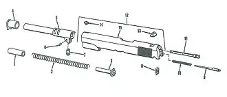 Na parte traseira do cano há um elo de articulação. Esse link é montado em um pino cilíndrico que faz parte da alavanca de remoção. À medida que o cano recua e alcança a parte traseira mais deslocada, o link gira em torno do pino de remoção e puxa o cano para baixo. Isso faz com que as nervuras na parte superior do cano sejam desengatadas, momento em que o slide continua a mover-se para trás para ejetar a caixa vazia do cartucho.