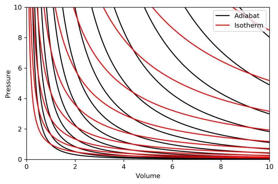As isotermas são as curvas vermelhas e as adiabatas são as curvas pretas. As adiabatas são isentrópicas. Volume é o eixo horizontal, e pressão é o eixo vertical.