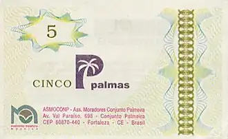 - ↑ IPEA - Banco Palmas: a serviço da comunidade - O real é a moeda oficial do Brasil... 2009, ano 6, edição 54, 30 de Outubro de 2009. Acessado em 24/08/2017.