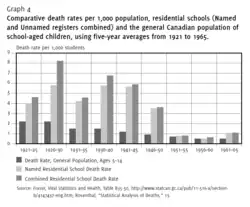 Mortes em escolas residenciais eram comuns e têm sido associadas a instalações mal construídas e mal mantidas.[7]:92–101 O número exato de óbitos permanece desconhecido devido à inconsistência dos relatos dos responsáveis pelas escolas e à destruição dos registros médicos e administrativos, em conformidade com as políticas de retenção e disposição dos registros do governo.[7]:92–93 Pesquisas da CVR revelaram que pelo menos 3.201 estudantes haviam morrido, majoritariamente por causa de doenças.[58][7]:92 O presidente da CVR, o juiz Murray Sinclair, sugeriu que o número de mortes pode ultrapassar 6.000.[59][60][61] A vasta maioria dos óbitos ocorreu antes da década de 1950.