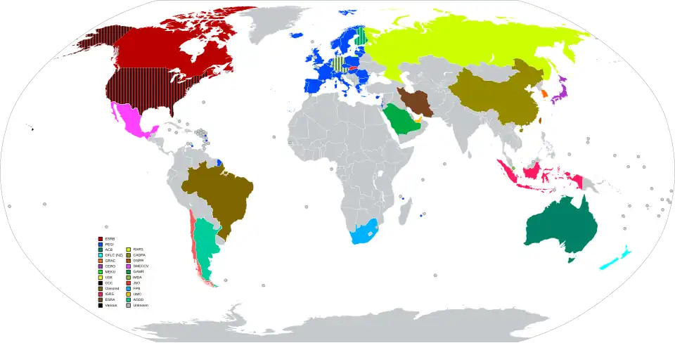 A imagem abaixo mostra o uso de vários sistemas de classificação de jogos eletrônicos ao redor do mundo. Países preenchidos com cores gradientes usam mais de um sistema de classificação.[carece de fontes]