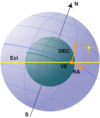 Sistema horizontal de coordenadas. DEC -Declinação, RA -Ascensão recta, VE - Ponto vernal, Ecl - Eclíptica.