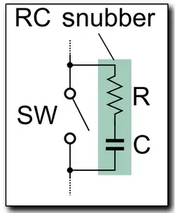 Um "Snubber RC simples" usa um pequeno resistor (R) em série com um pequeno capacitor (C).[1] Combinação que pode ser usada para suprimir o aumento rápido da tensão em cima de um tiristor, por exemplo, o que o impediria de ser ativado corretamente. O snubber limita a taxa de aumento na tensão (dV/dt) a um valor que não confunda o Gate do tiristor.