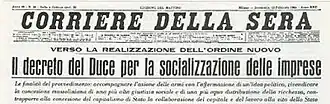 Em 1933, Mussolini anunciou que "o modo de produção capitalista foi superado", e com ele o liberalismo econômico, proclamando a implementação definitiva do corporativismo como um modelo a seguir, acrescentando que seria implementado gradualmente.[15] No inverno de 1941, Mussolini falou de um programa de socialização onde os trabalhadores faziam parte do governo fascista que considerava realizá-lo depois de vencer a guerra.[16] Em maio de 1943, Mussolini se encontraria com Tullio Cianetti. Nesse encontro, Cianetti daria a conhecer a Mussolini suas preocupações com o corporativismo, visto que as "posições capitalistas" haviam se fortalecido e havia "uma tendência ao monopólio". Ambos discutiriam a implementação da socialização.[17]