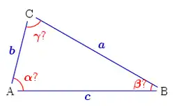 Sejam especificados três lados a, b, c. Para encontrar os ângulos α, β, a lei dos cossenos pode ser usada:[3]