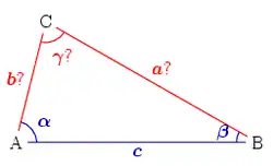 As características conhecidas são o lado c e os ângulos α, β. O terceiro ângulo γ = 180° − αβ. Dois lados incógnitos podem ser calculados pela lei dos senos:[6]
