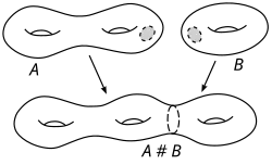 No entanto, há uma maneira canônica de escolher a colagem de e sendo uma única soma conectada bem definida.[1] Escolha as incorporações e de modo que preserve a orientação e inverta a orientação. Obtenha agora a partir da soma separada[carece de fontes]