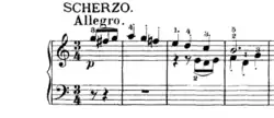 O terceiro movimento é, de novo, um Scherzo. Uma polifonia alegre cria um scherzo energético. O motivo de três colcheias aparece ao longo do movimento, que termina com um salto de oitava O trio passa rápido como um trem. Os acordes quebrados em forma de arpejo subindo e descendo criam uma atmosfera instável e sempre em movimento. A dificuldade aparece no final, com um arpejo descendente que não dá margem a rubatos ou "perdas de tempo." O interprete pode escolher tocá-lo bem fluido (com pedal) ou bem claro, (sem pedal). Qualquer que seja a escolha, o caráter deve ser mantido. A CODA desse terceiro movimento desfaz a energia acumulada no Scherzo e prepara de certo modo a entrada do Rondo final.