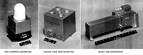 A carga útil com os instrumentos, pesava cerca de 36 kg, consistia de: três câmaras de ion com dosimetria, um tubo de medidor geiger com spectrômetro, e um detector de ions pesados. O motivo das três câmaras de ion, era para efetuar as medições sobre amostras diferentes de proteção: a primeira não teria proteção alguma, a segunda, teria uma proteção de espessura igual à do Módulo Lunar, e a terceira, com uma proteção de espessura igual à do Módulo de Comando.[1]
