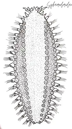 Os membros da família Sphaerodoridae são pequenos anelídeos bentônicos caracterizados pela presença de tubérculos e papilas glandulares esféricas na superfície corporal, dispostos longitudinalmente. Embora a maioria possua corpos curtos, compactos e elipsoides, semelhantes a larvas, convexos dorsalmente e com extremidades anterior e posterior arredondadas, também existem formas mais longas, com extremidade anterior terminando abruptamente, e posterior afilando progressivamente em direção ao pigídio, levemente achatados dorsoventralmente. Indivíduos vivos tendem a se enrolar quando extraídos do sedimento. Devido aos pequenos parapódios e respectivos apêndices curtos, sua morfologia difere muito da de outros Phyllodocida.[3]