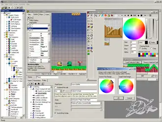 Tela do Scrolling Game Development Kit 2.0.0, programa de desenvolvimento de jogos, com o editor de mapas, editor gráfico e editor de sprites sendo exibidos.