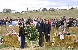 O memorial temporário original em homenagem aos passageiros e tripulantes do Voo 93 estava localizado em uma colina, a cerca de 500 metros (0,46 km) do local do acidente. Em 8 de julho de 2010, uma nova entrada e memorial temporários foram inaugurados em uma área chamada "Western Overlook" (em português: "Mirante Ocidental"). Foi lá que o FBI instalou seu centro de comando e onde os familiares viram pela primeira vez as consequências do acidente, levando suas próprias homenagens, que os visitantes podem deixar até hoje. A fase inicial da construção permanente do Memorial Nacional do Voo 93, incluindo o centro de visitantes, deveria ser concluída até o 10º aniversário, em 2011. A primeira fase do memorial permanente foi concluída, inaugurada e dedicada em 10 de setembro de 2011. O projeto atual do memorial é uma versão modificada da obra "Crescente do Abraço", de Paul e Milena Murdoch. O memorial foi construído ao redor do local do acidente, seguindo a trajetória de voo do avião, e protege a área de impacto, conhecida como "Terreno Sagrado", que permanecerá protegida e acessível apenas aos familiares dos passageiros e da tripulação.