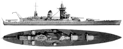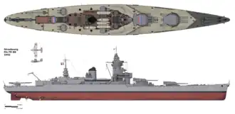 | Blindagem | Cinturão: 283 mm Convés: 115 a 125 mm Anteparas: 210 a 228 mm Torres de artilharia: 150 a 360 mm Torre de comando: 130 a 270 mm |