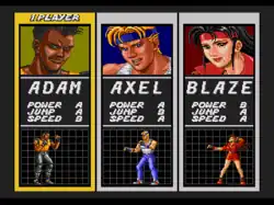 - Blaze Fielding (direita) é uma ex-policial e especialista em judô de 21 anos. Ela é um pouco mais fraca do que os outros personagens, mas é a mais ágil dos três pois pode se movimentar mais rápido. Seu salto é um pouco inferior ao de Adam. Seu hobby é a lambada.