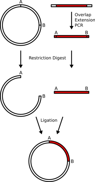 Durante o primeiro passo de uma subclonagem, enzimas de restrição são utilizadas para liberar a sequência de DNA (denominada inserção) correspondente ao gene de interesse do vetor parental. A inserção é então purificada, evitando assim a contaminação com outras moléculas de DNA (como, por exemplo, vetores cortados completa ou parcialmente, DNA de microrganismos). A purificação da inserção é normalmente realizada por eletroforese em gel. Após isso a inserção é amplificada por PCR.