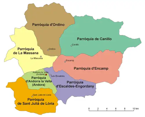 - ↑ «Parishes, cities, villages of Andorra – Focus on the Principality». www.setupandorra.com. Consultado em 5 de fevereiro de 2020