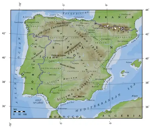 ![]() Mapa orográfico da Península Ibérica | |