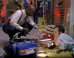 ![]() Frank Pembleton fala com John Lange, um homem preso entre um trem de metrô e a plataforma. | |||
