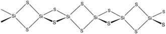 Forma-se o material pelo aquecimento de de silício e enxofre, ou pela reação de dupla troca entre SiO2 e Al2S3. Sua estrutura são cadeias de tetraedros ligados pelas arestas: Si(μ-S)2Si(μS)2 etc. A distância Si---Si é de 214 picometros, menor que as distâncias usuais das ligações simples Si-Si.[2]