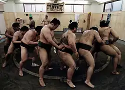 Distinções semelhantes são feitas na vida no centro de treinamento. Os lutadores iniciantes devem acordar mais cedo, por volta das 5 horas da manhã, para treinar enquanto os sekitori podem começar por volta das 7 horas da manhã. Quando os sekitori estão treinando, os lutadores iniciantes podem ter tarefas para fazer, como ajudar a fazer o almoço, limpar e preparar o banho ou segurar uma toalha para um sekitori. A hierarquia é preservada na ordem de precedência do banho após o treino e na refeição.