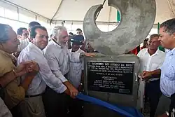 | Símbolo do DERBA acompanhado de placa comemorativa de obra em trecho da rodovia BA-411. | |