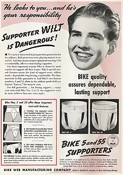 O suporte atlético foi inventado em 1874 por C. F. Bennett, de uma empresa de artigos esportivos de Chicago, Sharp & Smith, para fornecer conforto e apoio aos ciclistas que trabalhavam nas ruas de paralelepípedos de Boston. Em 1897, a recém-formada Bike Web Company de Bennett patenteou e começou a produzir em massa a Bike Jockey Strap.[5] A Bike Web Company mais tarde ficou conhecida como Bike Company. A Bike, até 2003, era uma empresa autônoma. Naquele ano, a empresa e suas marcas foram adquiridas pela Russell Athletic. Russell Athletic continuou a produzir suportes atléticos usando a marca e logotipos da Bike até 2017, quando aposentou a marca. Russell tornou-se uma subsidiária da Fruit-of-the-Loom, e a Fruit-of-the-Loom é propriedade da Berkshire Hathaway e parte dela.