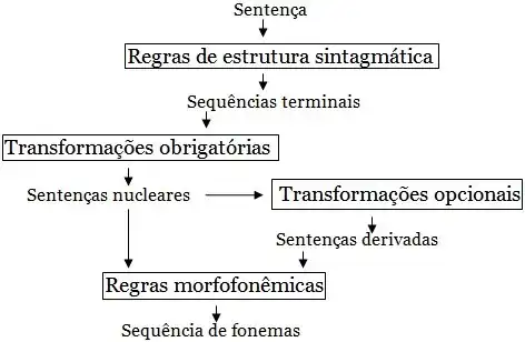 A gramática transformacional de Chomsky possui três partes: regras de estrutura frasal, regras transformacionais e regras morfofonêmicas.[62] As regras de estrutura frasal são usadas para expansão de categorias gramaticais e para substituições, o que produz uma série de morfemas. A regra transformacional "opera em uma determinada sequência [...] com uma determinada estrutura constituinte e a converte em uma nova sequência com uma nova estrutura constituinte derivada."[6] Elas "podem rearranjar a sentença ou adicionar/excluir morfemas."[63] Essas regras são de dois tipos: obrigatórias ou opcionais. As transformações obrigatórias aplicadas em "sequências terminais da gramática [Σ, F]"[64] produzem o "núcleo da língua".[62] Por outro lado, para produzir sentenças passivas, negativas, interrogativas ou complexas, uma ou mais regras de transformação opcionais devem ser aplicadas em uma ordem particular das sentenças nucleares. No estágio final da gramática, regras morfofonêmicas convertem uma sequência de palavras em uma sequência de fonemas.[63] Por fim, Chomsky aplica a ideia das regras transformacionais no sistema de verbos auxiliares do inglês.[65]