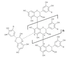 Representação esquemática de uma molécula de tanino condensado. Taninos condensados podem ser lineares (com 4→8 ligações) ou ramificados (com 4→6 ligações - linha pontilhada).