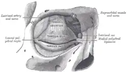 O tarso da pálpebra é uma faixa densa de tecido conectivo presente nas pálpebras superiores e inferiores do olho humano. Esse tecido se liga medialmente, entre o nariz e o ângulo medial do olho, ao ligamento palpebral medial, conectando o tarso à margem medial da órbita e dando inserção ao músculo orbicular do olho. De modo semelhante, o ligamento palpebral lateral conecta o tarso à margem lateral da órbita. Junto com a pele da pálpebra superior, o tarso superior serve como inserção para o músculo levantador da pálpebra superior.[1]