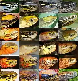 Retrato da cabeça das diferentes espécies, subespécies e variedades de Cuora (da esquerda para a direita/de cima para baixo):