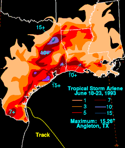 A tempestade tropical Arlene trouxe chuvas torrenciais em junho de 1993 para a costa oeste do Golfo dos Estados Unidos, particularmente para o estado americano do Texas. A primeira tempestade nomeada da temporada anual de furacões, Arlene desenvolveu-se a 18 de junho a partir de uma área de baixa pressão na Baía de Campeche. A depressão fortaleceu-se lentamente enquanto seguia oeste-noroeste e depois norte-noroeste através do oeste do Golfo do México. Arlene foi posteriormente atualizada para uma tempestade tropical a 19 de junho, mas não se intensificou ainda mais devido à sua proximidade com a terra. O ciclone atingiu então a ilha de Padre, no Texas, com ventos de 40 mph (65) km/h) e degenerou em distúrbio remanescente em 21 de junho.