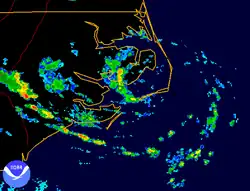 Tempestade tropical Arthur no pico de intensidade pouco fora da costa da Carolina do Norte em 19 de junho | |