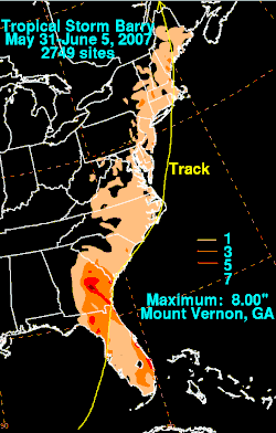 - ↑ a b c d Rubin-Oster (2007). «Public Advisory Number 7 for Remnants of Barry». Hydrometeorological Prediction Center. Consultado em 3 de junho de 2007[ligação inativa]