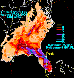 Os dois maiores índices de precipitação acumulada foram de 702 mm em Windover Farms, a cerca de 13 km a noroeste de Melbourne, Flórida, e 699 mm em Thomasville, Geórgia. Isto faz de Fay uma das tempestades mais chuvosas do sudeste dos Estados Unidos em toda a história.