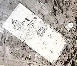 O complexo era extenso sob uma área de 45.000 metros quadrados[22] do perímetro de 200 metros por 175, sustentado a justante por subestruturas triangulares e a montante por nichos semicirculares em quais provavelmente haviam as estátuas e um terraço superior.[22] Ao interior da plataforma corriam dois pórticos da ordem dórica, um com colunas rebocadas em vermelho, outro com colunas de pedras cinzas escuras; eram estátuas, ambientes para sacerdotes, alojamento para os peregrinos, celas doarias, um templo, banhos hidroterápicos e até mesmo um teatro; de toda essa estrutura são visíveis uma parede de grandes nichos, uma parte do pronau com ao menos um altar votivo, e algumas lacunas.