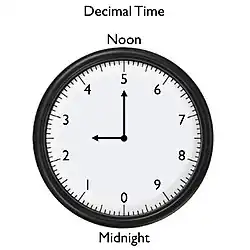 Com o dia começando à meia-noite, o tradicional meio-dia eram 5 horas. No final do dia, à meia-noite, eram 10 horas. Muitos relógios decimais foram construídos na época, os quais agora são peças de museu, porque já em 1795 o tempo decimal foi abolido na França, dez anos antes da abolição do calendário republicano francês.