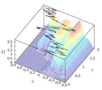 onde é o processo de difusão e é a função delta de Dirac. É uma noção inventada por Paul Lévy. A ideia básica é que é uma medida (reescalonada) de quanto tempo dispendeu em até o momento . Pode ser escrito como: