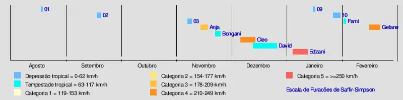 O gráfico abaixo mostra de forma clara a duração e a intensidade de cada ciclone tropical: