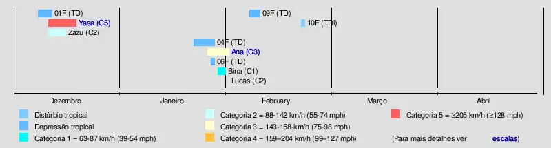 A temporada começou com a formação da depressão tropical 01F, mais de um mês após o início oficial. Em meados de dezembro, o ciclone tropical Severo Yasa tornou-se o quarto ciclone tropical mais intenso registado na bacia do Pacífico Sul, com uma pressão barométrica mínima de 899 milibares. Yasa atingiu Fiji, resultando em danos pesados. O ciclone tropical severo Ana e o ciclone Tropical Bina também afetaram Fiji em poucos dias, resultando em fortes chuvas e fortes ventos. O ciclone Tropical Lucas atravessou a bacia da região australiana e afetou a província das ilhas de Lealdade.