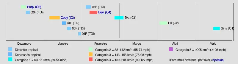 | Dovi | 6 – 12 de fevereiro | Ciclone tropical severo categoria 4 | 175 km/h (110 mph) | 940 hPa (28 inHg) | Vanuatu, Nova Caledónia, Norfolk Island, Nova Zelândia | $80 000 000 | 1 | [33] |